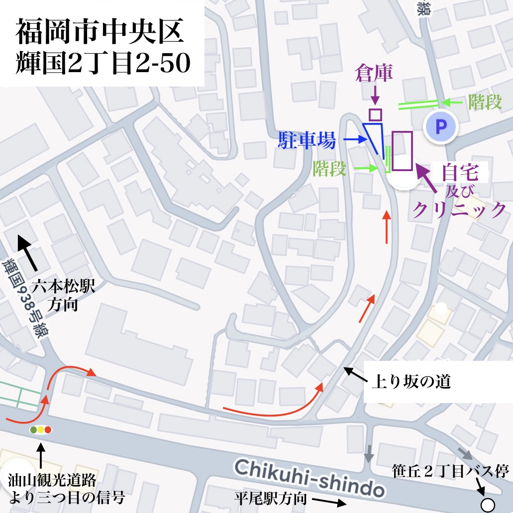 そのまま南方向へ約15分直進し、「筑肥新道(平尾方面へ続く大通り)」付近まで進みます。その後は、上記の地図の矢印に従って坂道を上がると、右手にクリニックが見えてきます。
